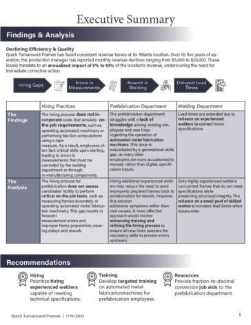 Situation: Many manufacturing companies face delays in their production processes, impacting efficiency and output. For this project, I analyzed this common industry challenge and developed a mock client report to propose solutions.